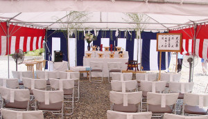 各種式典会場設営、野外テント、印刷・記念品、結婚式・披露宴会場設営、音響・照明、神官・司祭、祭壇、生花・花輪、司会者、舞台・講演台、氷彫刻、、アトラクション、金屏風・紅白幕、模擬店屋台、コンパニオン、企画・演出・進行、調理師・ボーイ、テーブル・椅子、写真・ビデオ 他小物必需品