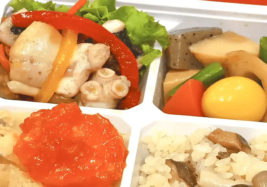 | 前菜 | 海老湯葉巻揚げ、蓮ノ芽、鮭の照焼き、くわい揚煮、卵黄味噌漬け、バイ貝旨煮 |