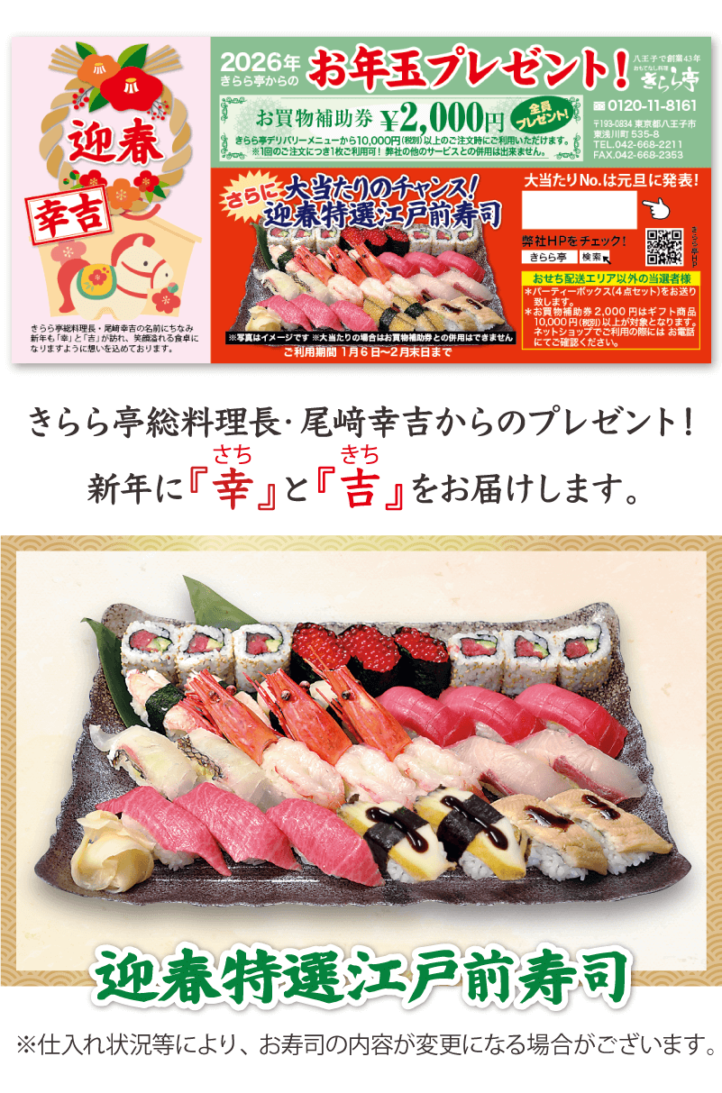 当たらなかった方も本券はきらら亭デリバリーメニューから1枚2,000円お買物補助券としてご使用いただけます。