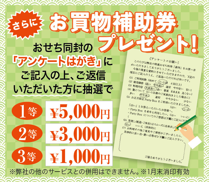 ※おせち配送エリア以外の当選者様はお買い物補助券2,000円はギフト商品10,000円(税別)以上が対象となります。