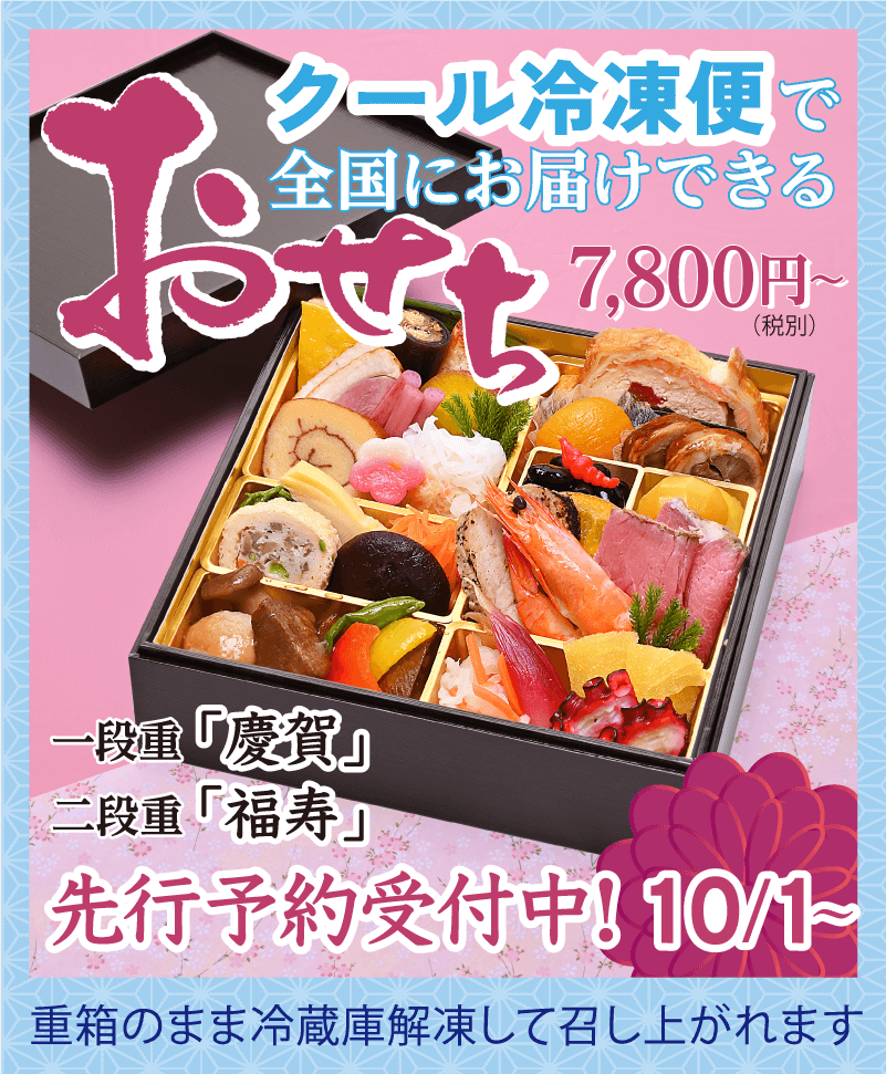 【お申込み方法】 お電話もしくは各ページ「WEBからのご注文はこちら」ボタンよりお申し込みください。 ●恐縮ですが生のおせちにつき地方発送はできません。 ◆三段重「豊楽」の100セットのみ、八王子・日野市を除く、関東圏1都7県に冷蔵便でお届けします! 限定100セット(冷蔵便)三段重「豊楽」のご購入はこちら>> ※「豊楽」の限定100セットの地方発送分には、梱包・発送手数料 別途1,000円(税込)必要です。 ◆お一人様おせち「慶賀」・おせち料理 二段重「福寿」は冷凍便でお届けします! 冷凍で全国にお届け!「福寿」「慶賀」のご購入はこちら>> |