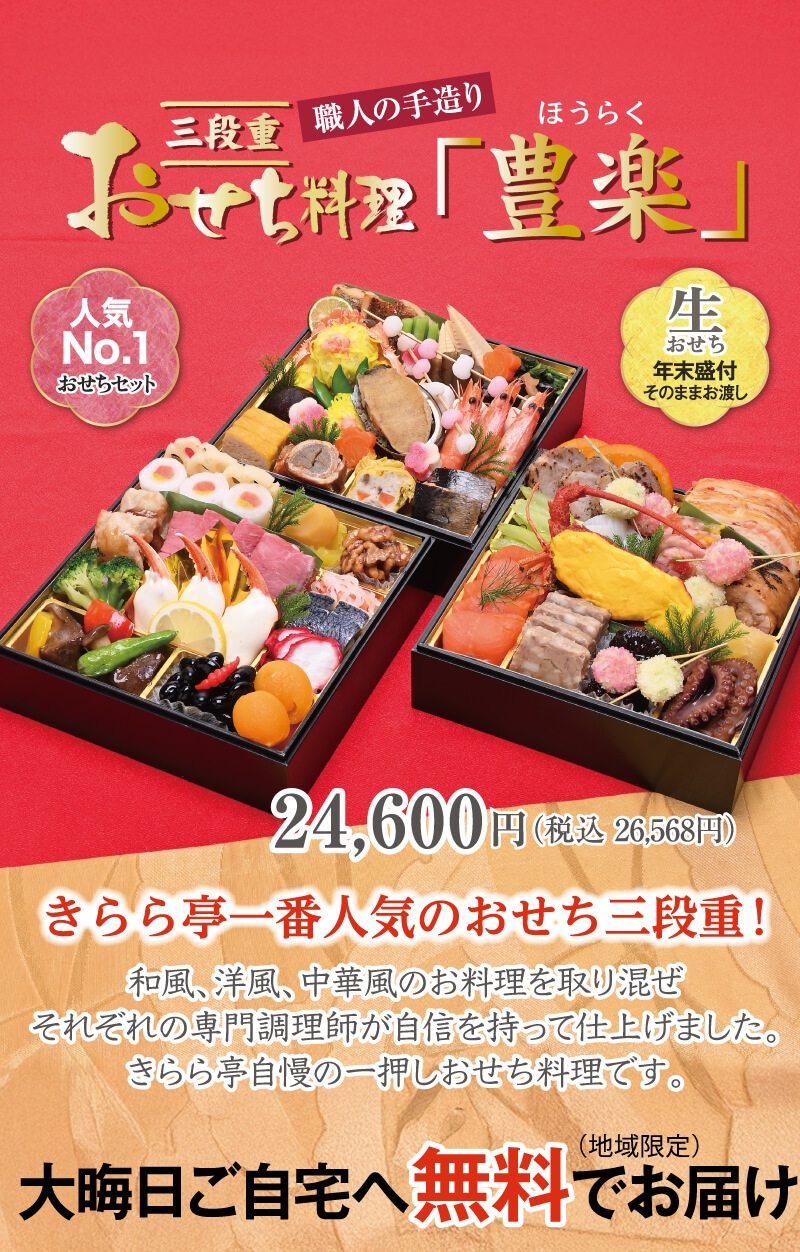 【お申込み方法】 お電話もしくは各ページ「WEBからのご注文はこちら」ボタンよりお申し込みください。 ●恐縮ですが生のおせちにつき地方発送はできません。 ◆三段重「豊楽」の100セットのみ、八王子・日野市を除く、関東圏1都7県に冷蔵便でお届けします! 限定100セット(冷蔵便)三段重「豊楽」のご購入はこちら>> ※「豊楽」の限定100セットの地方発送分には、梱包・発送手数料 別途1,000円(税込)必要です。 ◆お一人様おせち「慶賀」・おせち料理 二段重「福寿」は冷凍便でお届けします! 冷凍で全国にお届け!「福寿」「慶賀」のご購入はこちら>> |