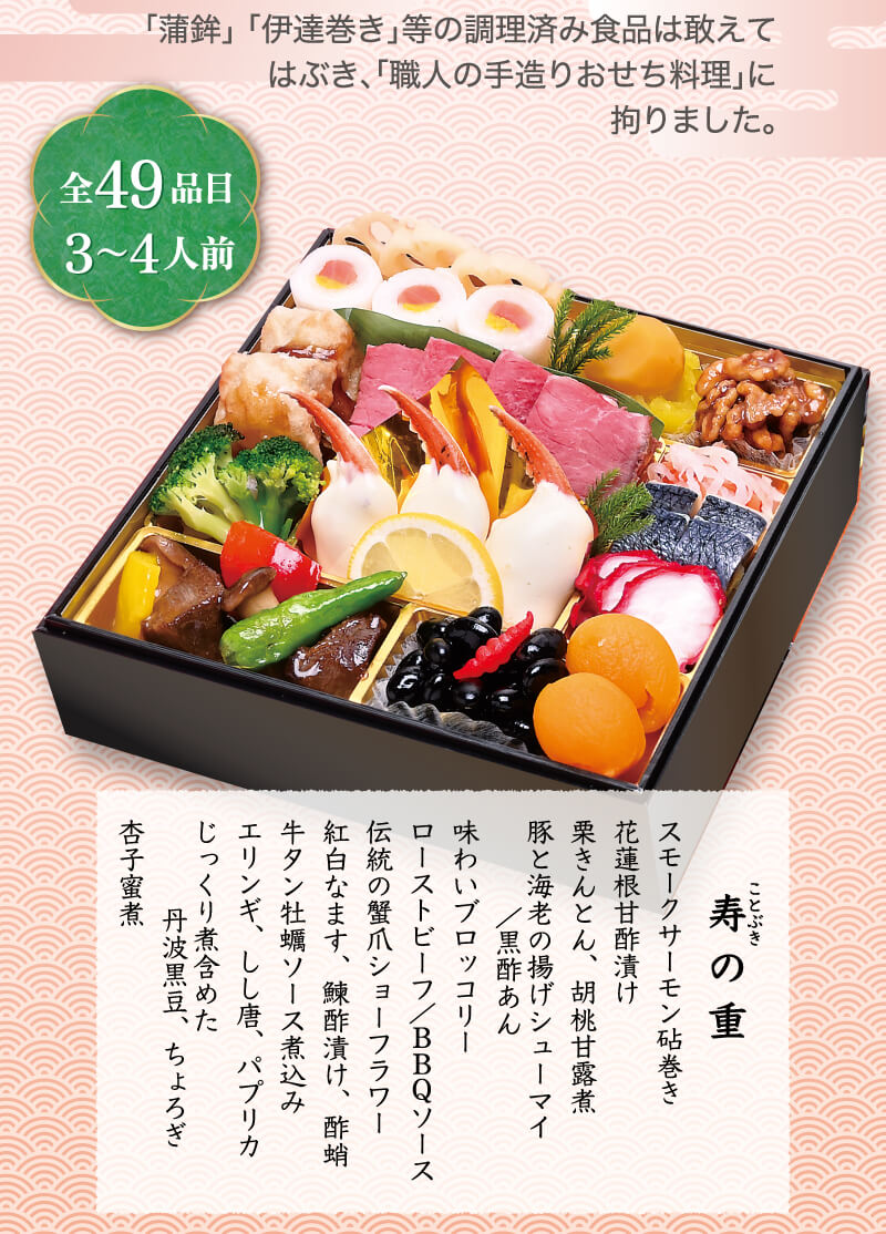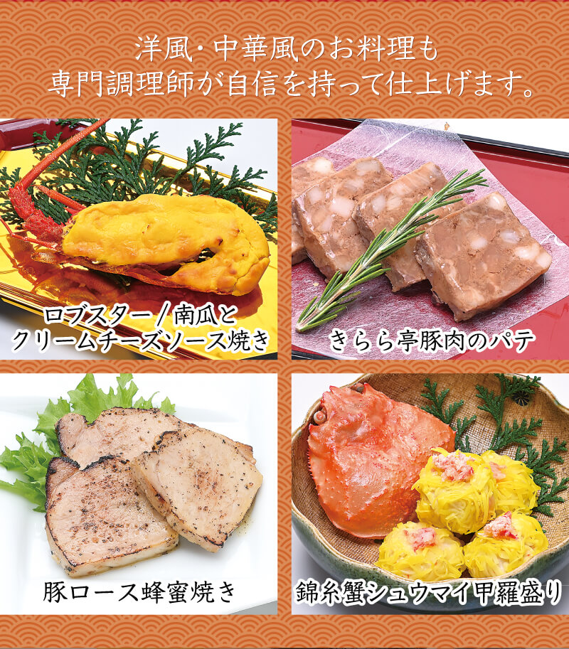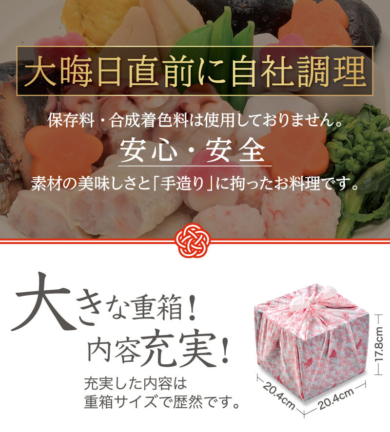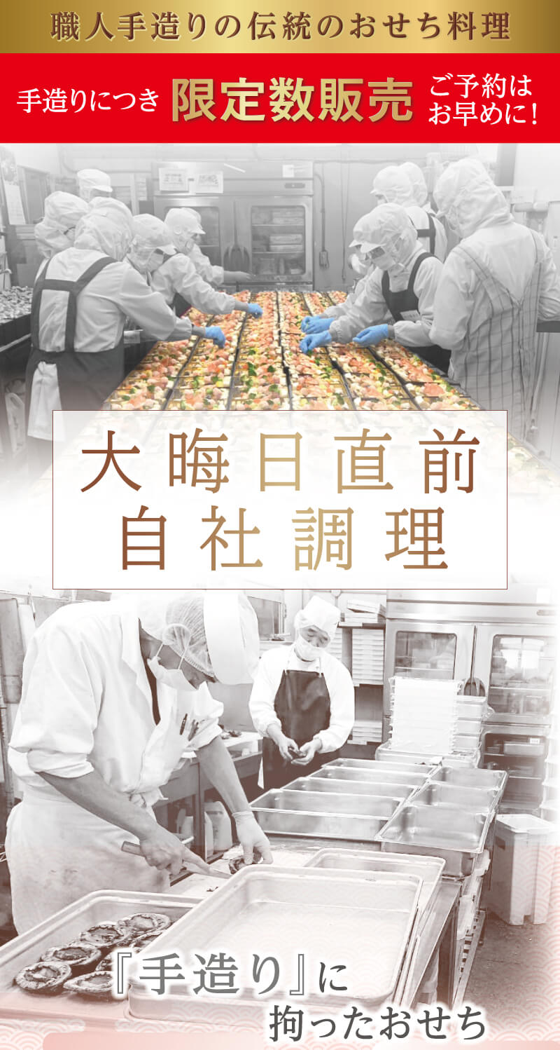 - 大晦日前日から大晦日に掛けて仕上げるおせち料理に付き、お届け時間のご指定はご容赦ください。