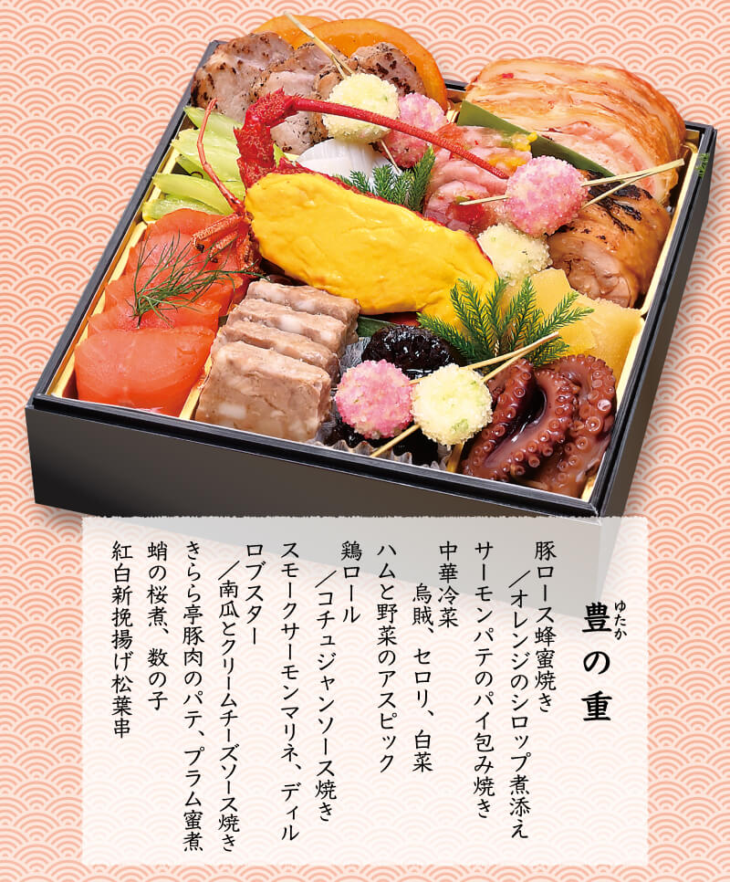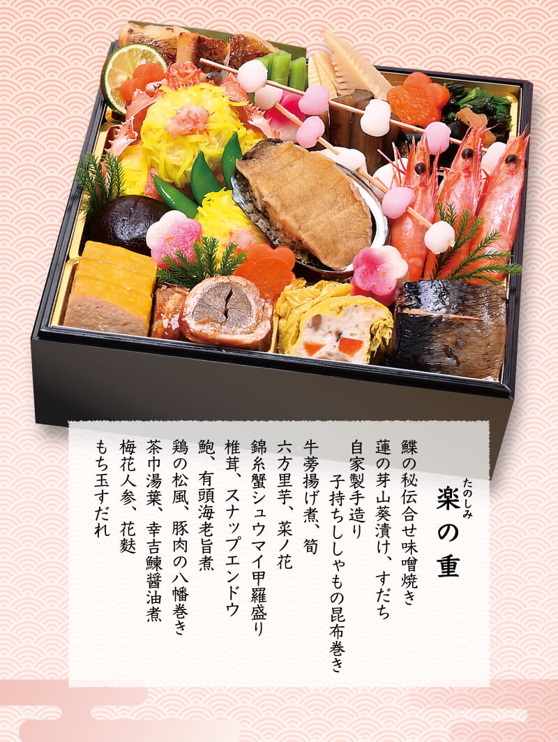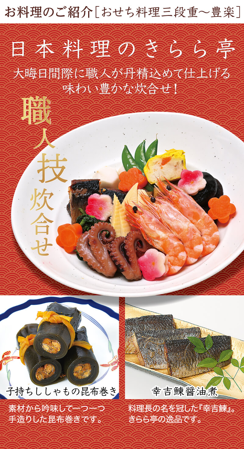 【お申込み方法】 お電話もしくは各ページ「WEBからのご注文はこちら」ボタンよりお申し込みください。 ●恐縮ですが生のおせちにつき地方発送はできません。 ◆三段重「豊楽」の100セットのみ、八王子・日野市を除く、関東圏1都7県に冷蔵便でお届けします! 限定100セット(冷蔵便)三段重「豊楽」のご購入はこちら>> ※「豊楽」の限定100セットの地方発送分には、梱包・発送手数料 別途1,000円(税込)必要です。 ◆お一人様おせち「慶賀」・おせち料理 二段重「福寿」は冷凍便でお届けします! 冷凍で全国にお届け!「福寿」「慶賀」のご購入はこちら>> |