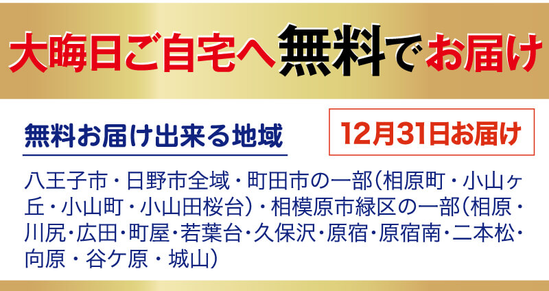 【お届け出来る地域】 八王子市・日野市全域・町田市の一部(相原町・小山ヶ丘・小山町・小山田桜台)相模原市緑区の一部(相原町・川尻・広田・町屋・若葉台・久保沢・原宿・原宿南・二本松・向原・谷ケ原・城山) この他の地域のお客様は恐れ入りますが、12月31日にご来社くださいますようお願い申し上げます。 当店の案内図はこちら |
