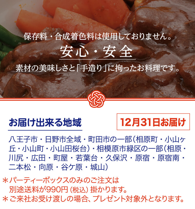 【お届け出来る地域】 八王子市・日野市全域・町田市の一部(相原町・小山ヶ丘・小山町・小山田桜台)相模原市緑区の一部(相原町・川尻・広田・町屋・若葉台・久保沢・原宿・原宿南・二本松・向原・谷ケ原・城山) この他の地域のお客様は恐れ入りますが、12月31日にご来社くださいますようお願い申し上げます。 当店の案内図はこちら |